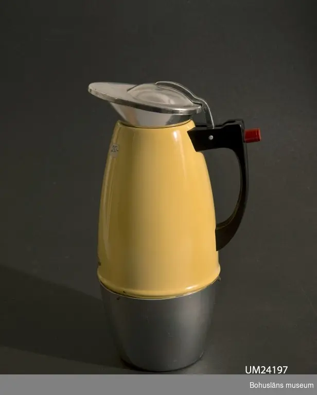 Svart plasthandtag. På handtaget finns en röd knapp. När man trycker på knappen går locket upp. Kannan är ljusgul med detaljer i omålat stål. Det finns ett gulmetallmärke med en drake och kinesiska(?) tecken. Skruvlock saknas.