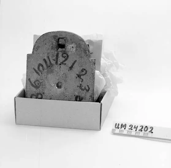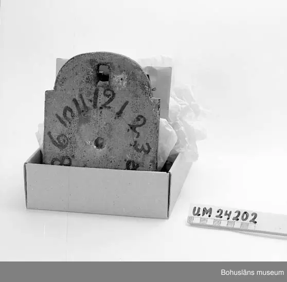 471 Tillverkningstid 1780 410 Mått/Vikt !H: 24 CM 106 OCM *805,405 381 H. Berntssons morfarsfarsfar. 394 Värmland. 601 Förmodligen ommålad för 80 - 90 år sedan. 602 Den är i 13 lösa delar. Lod och pendel saknas. Givarens mor heter 603 Elsa Wetterstrand (Uddevalla). Tillverkaren var vallon och invandrade 604 till Värmland. Hans son, Nils Haugman f. 1809 var bruksarbetare i 605 Värmland och dennes s...