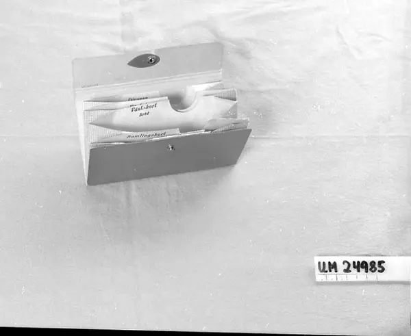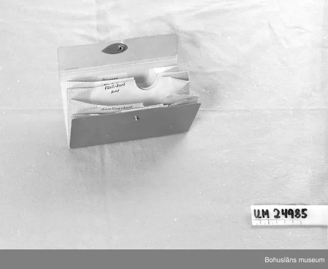 471 Tillverkningstid 1939-1945 410 Mått/Vikt !FODRAL L:16.8, B:10 CM 106 OCM *722,433 151 Sakord *FODRAL 594 Landskap VÄRMLAND 601 Fodralet är gjord av röd papp. En röd tryckknapp. Fyra stycken fickor. 602 Fickorna har olika namn. "Diverse" i den ligger ett Tillståndsbevis 603 se UM24986 samt en 1-öring från 1939. "Växel.-kort Kött" i den ligger 604 delar av fyra stycken kuponger för kaffe. "Växel.-kort Bröd" i den 605 ligger delar av två stycken kuponger för kaffe. "Samlingskort" i den 606 ligger ett personkort från vilket delar har klippts. Kortet är utfärd- 607 på Christiansen Inger Marie född 30 oktober år 1890, yrke Kanslibiträ- 608 de. Hemvist Kv. Älgen 4, Drottninggatan 41 b. Kortet är utställt av: 609 "KARLSTADS STADS KRISTIDSNÄMND".