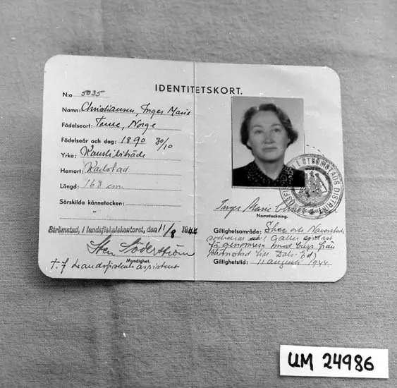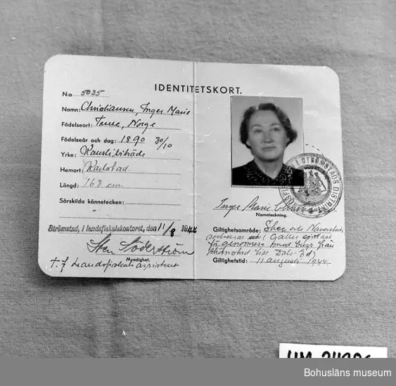 "TILLSTÅNDSBEVIS för Christiansen, Inger Marie att passera av militär myndighet anordnade avspärrningar (vägspärrar m.m.) inom Skee & Naverstads socknar. Gäller endast för genomresa med buss från Strömstad t. Dals-Ed.