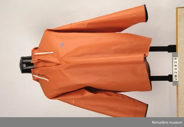 Orangefärgad jacka, halsknäppning, huva. Tillhörande märkesetikett med produktionsuppgifter och skötselråd. Modellnamn: "Brigg Slipover". På vänstra sida bröstet i blått tryck ett segelfartyg och "Brigg".