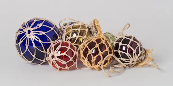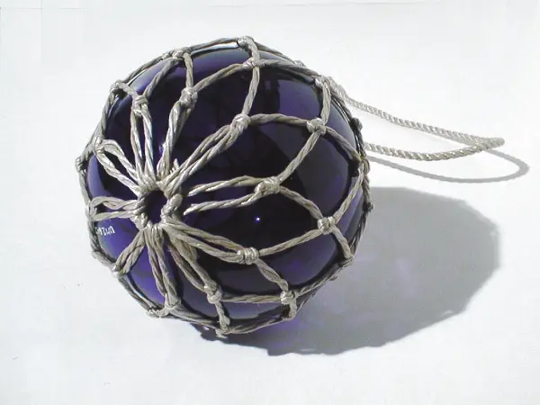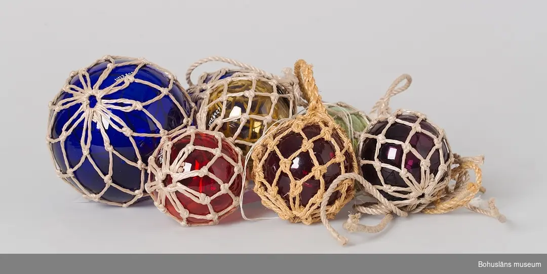 Föremålet har ingått i varulagret i Torvald Strannes skeppshandel på Smögen. Stranne hade skeppshandel och trålfabrik. Efter 1960 var det endast en järnhandel. I butiken såldes glaskulor både till yrkesfiskare och turister. Före andra världskriget importerades kulor från Tjeckoslovakien. Under kriget gick man över till kulor tillverkade på AB Björkshults Glasbruk i Småland. Alla kulor märktes med Strannes namn. Kulorna gjordes i flera olika färger. Blått, grönt och violett tillverkades från början av 1940-talet. Rött och gult började tillverkas i slutet av 1940-talet. Ursprungligen var det garn av manillahampa runt kulorna. På 1950-talet gick yrkesfiskare över till kulor av plast. Glaskulornas nät byttes ut till garn av konstmaterial som beställdes från Carlmarks i Älvängen. Butiken gjorde själva nätet och detta garn var snällare för händerna än manillahampan. En nätnål användes vid tillverkningen av nätet; se UM026429. I slutet av 1930 började turister att köpa kulor som souvernirer. Firman "Svenskt hantverk" i Uddevalla köpte kulor av Stranne och sålde i sin tur vidare till hela Sverige. 1968 slutade Stranne med sin verksamhet. Torvald Stranne var givarens far. Torvald Stranne, född 1898 och död 1972.