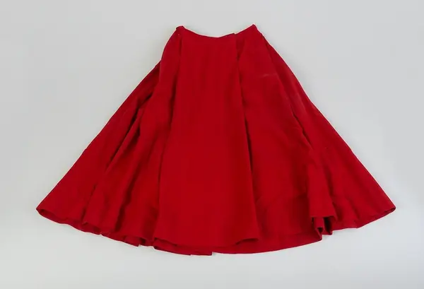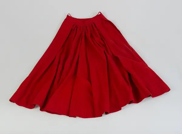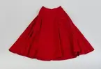 • Midjekjol av rött ylletyg, ofodrad med stor vidd nertill. Dubbelvikt linning.