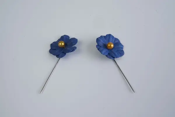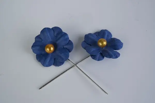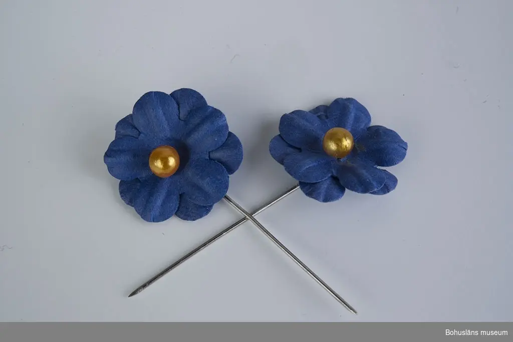Två majblommor för år 2007 med kronblad präglade i vågig blå papp med knappnålshuvud. och metallnål.