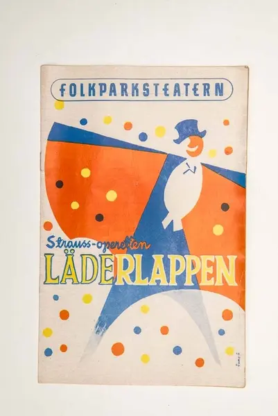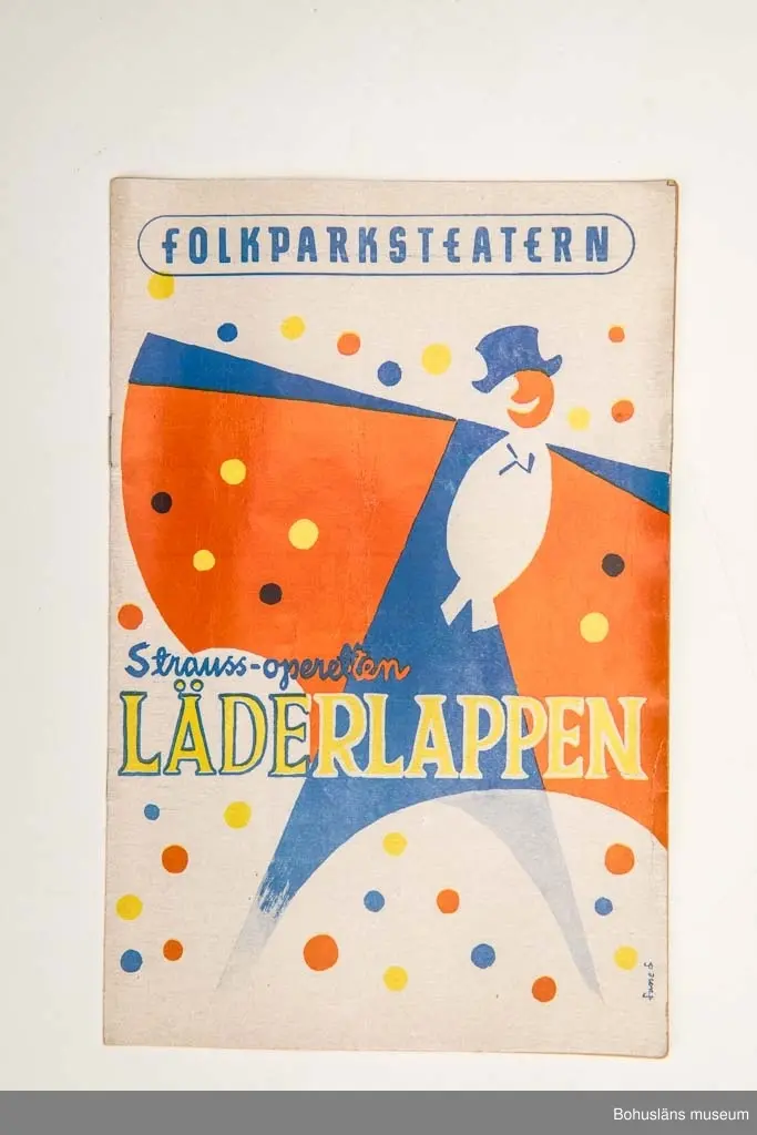 Tryckt teaterprogram, Folkparksteatern "Läderlappen" 1957. Trefärgat omslag och inlaga 24 sidor sv/v med presentation av föreställningen och den aktuella uppsättningen med dess medverkande, ibland med fotografier. Annonser.