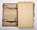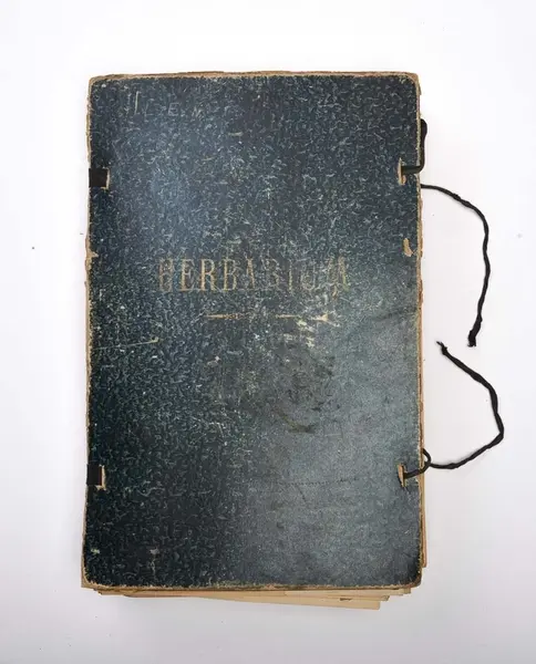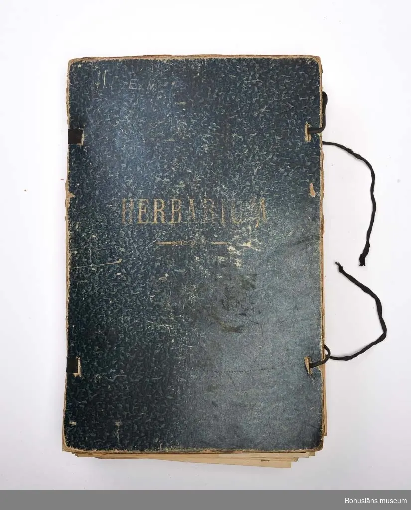 Blåmarmorerad mapp i hård papp. Fyra svarta bomullsband håller ihop mappen som knyts i ena sidan. På framsidan påtryckt text i guld: HERBARIUM På den främre pärmsidans insida en blå stämpel med text ...