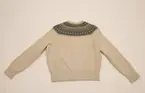 Stickad kofta med lång ärm, stickad enligt "gamla rundstingningen". Jumpern är slätstickad i de enfärgade partierna med resårstickad halsringning, muddar och nederkant. Oket är mönsterstickat med räta...