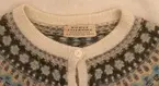 Stickad kofta med lång ärm, stickad enligt "gamla rundstingningen". Jumpern är slätstickad i de enfärgade partierna med resårstickad halsringning, muddar och nederkant. Oket är mönsterstickat med räta och aviga maskor i nyanser av blått, grått och grönt, mot en ljus beige botten. Knäppning fram med tio syntetiska knappar. Originaletikett: BOHUS STICKNING HANDKNITTED ALL WOOL