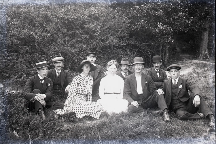 Landskap, bild: Bohuslän. Landskap, fotograf: Bohuslän. Gruppbild på 9 personer i gröngräset, är från föreningen Exellsivo. Några av medlemmarna troligen vid något av föreningens första år. Främre raden från vänster. 1. Hjalmar Fredriksson, Torp. 2. Signe Fredriksson, Torp. 3. Viktoria Olsson, Rännan Gullmarsberg. 4. Oscar Olsson, Rännan Gullmarsberg. 5. Henning Johansson, Hästeryr. Bakre raden f...