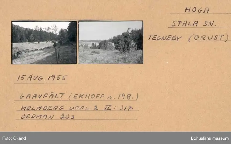 Noterat på kortet: "Hoga Stala S. Tengeby (Orust)." "Gravfält." (Ekhoff s.198.)" "Holmberg uppl. 2 II : 317." "15 Aug. 1955."