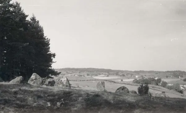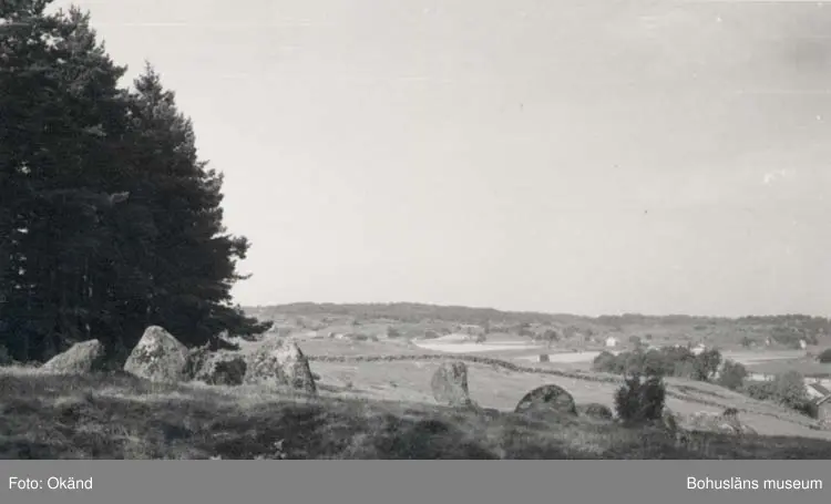 Noterat på kortet: "Hoga Stala Sn. Tengeby (Orust)." "Utsikt nordost från Domarringarna." "(Ekhoff s.198.)" "15 Aug. 1955."