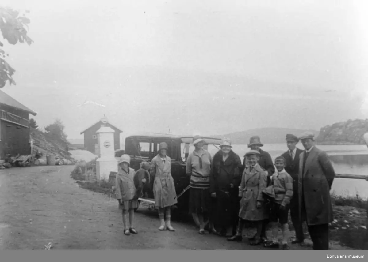 Enligt text på baksidan av fotot: "Slussen, Orust ca 1930. Från höger: Robert Hansson, Eskil Wetterström?, Nisse Holmberg, Roger Hansson, ?, Johanna Wetterström, ?, ?, ?".