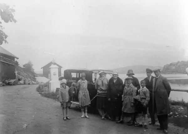 - Enligt text på baksidan av fotot: "Slussen, Orust ca 1930. Från höger: Robert Hansson, Eskil Wetterström?, Nisse Holmberg, Roger Hansson, ?, Johanna Wetterström, ?, ?, ?".