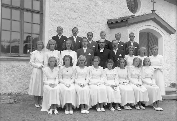 Enligt fotografens journal nr 7 1944-1950: "Jörlanda Konfirmander Pastor Nyblom".