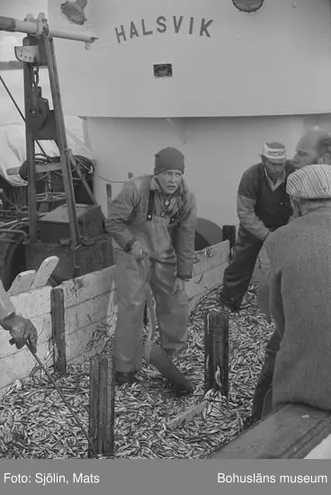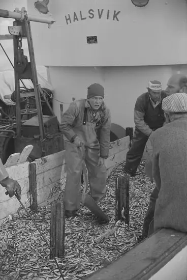 "Halsvik Styrsö" vid kaj och lossar skarpsill för transport till Ängholmens fabrik.