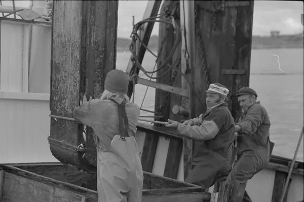 "Halsvik Styrsö" lossar skarpsill för transport till Ängholmens fabrik.