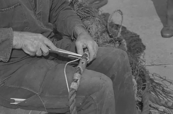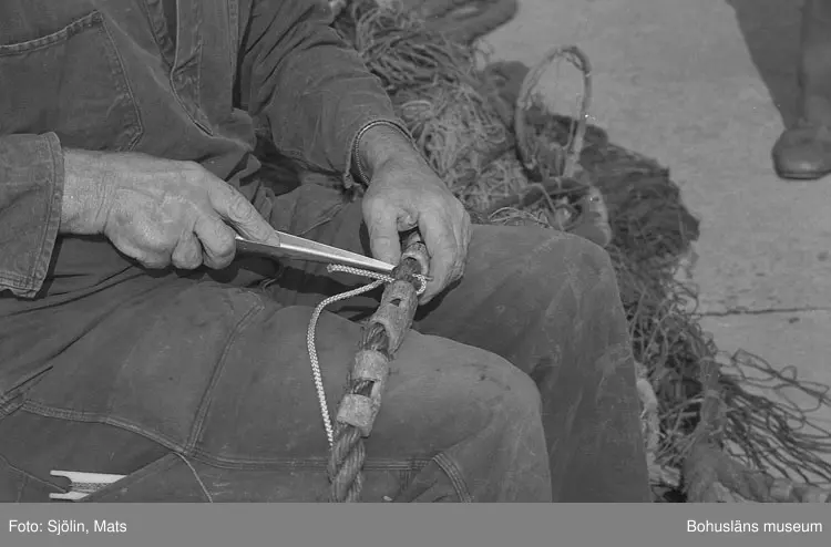 Fotografer: Mats Sjölin, Kerstin Olsson, Rolf Danielsson och Lars-Erik Hammar. Bohusläns samhälls- och näringsliv. 5. FISKET. En man som splitsar ett rep med märlspik. Splitsa = Hopflätning av ändar av tågvirke, t.ex. för att göra en ögla, eller hopflätning av ändar.