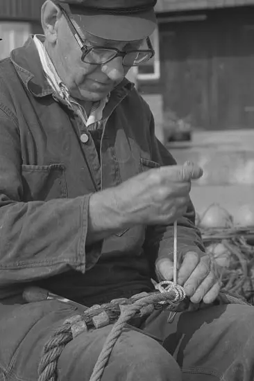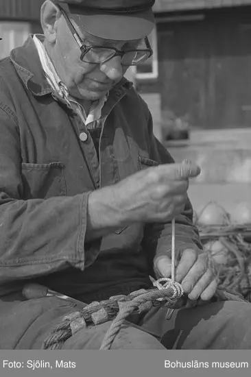 Fotografer: Mats Sjölin, Kerstin Olsson, Rolf Danielsson och Lars-Erik Hammar. Bohusläns samhälls- och näringsliv. 5. FISKET. Splitsa = Hopflätning av ändar av tågvirke, t.ex. för att göra en ögla, eller hopflätning av ändar.