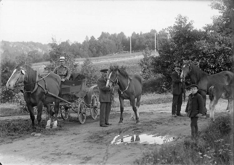 Tre hästar befinner sig på vägen. En drar en kärra med en kusk. De andra hästarna hålls av två män. En pojke står bredvid och tittar.