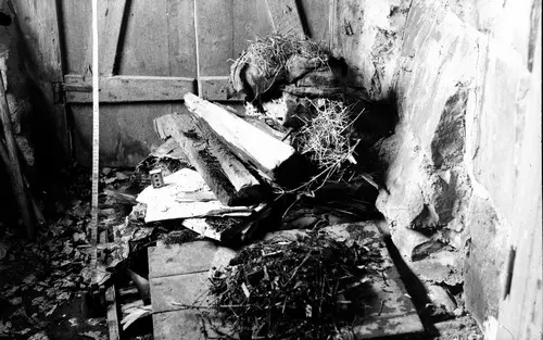 • Brasved och tändsticksask fotograferat i okänt källarutrymme.