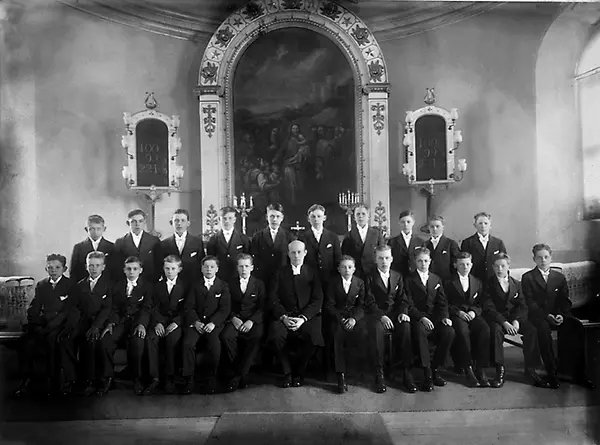 En konfirmationsgrupp, bestående av enbart pojkar i svarta kostymer, har samlats i koret med sin konfirmationspräst.
