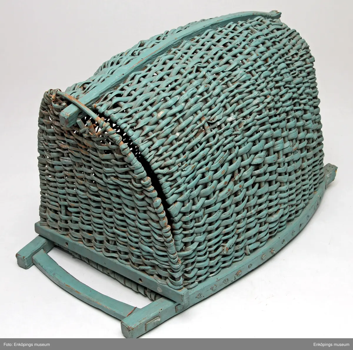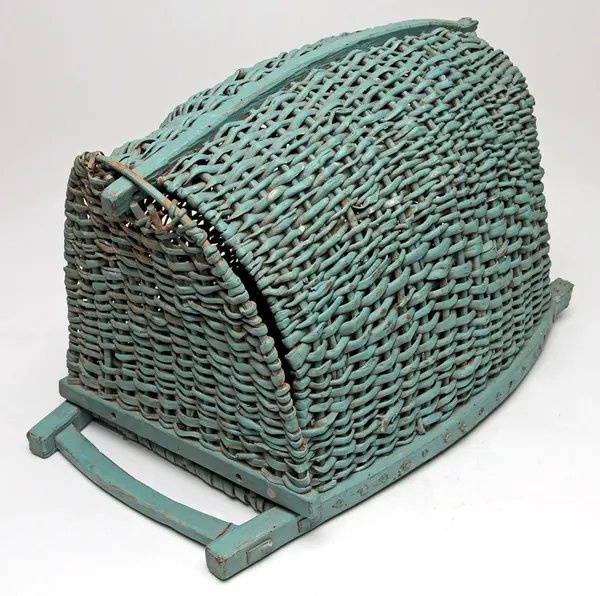 • Fiskkorg av vidjor med konstruktion av trä, grönmålad. Går att öppna helt.