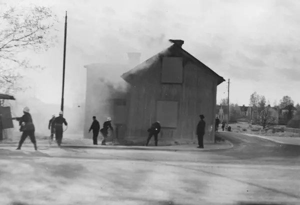 - Enköping, stadsägan 231, Kölnbacksgatan 1 A, brandövning våren 1954, från Fjärdhundragatan, mot nordväst