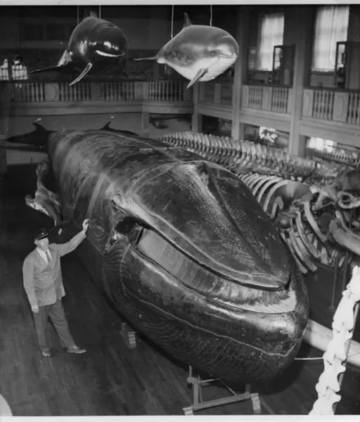 'Malmska valen, valsalen. Vy över valsalen. 1 man, vaktmästare, stående invid malmska valen iklädd skärmmössa. Balkongen synlig. I taket hänger ytterligare monterade valar. Malmska valens skelett intill. :: :: Malmska valen har Coll.an. Nr. 395.'