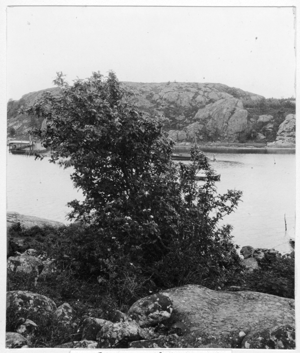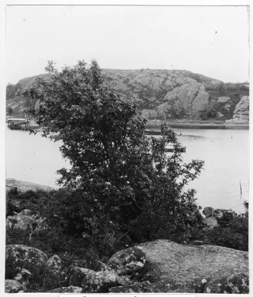 'Bildtext: ''Finsk oxel (Sorbus fennica) = Rönnoxel (Sorbus hybrida). 7 meter hög.'' Vy med kal berghäll med båtar i vatten framför. I förgrunden finsk oxel växande bland stenblock. :: :: Fotonr. 7046:119-185 indelade som ''Märkvärdiga träd i Göteborgs län och Bohus län''. Ingår i serie med fotonr. 7046:1-383, 7047:1-33 och 7048:1-67 med bilder från Länsjägmästare John Lindners bildarkiv.'