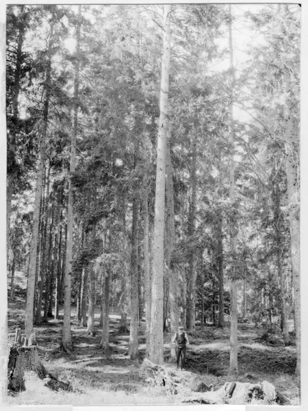 • 'Bildtext: ''140-årig naturskog av tall och gran.'' 1 man stående invid stam av tall. Stubbar i förgrunden. Se även fotonr. 7046:245. :: :: Fotonr. 7046:234-275 indelade som ''Naturskogsbestånd i Göteborgs län och Bohus län''. Ingår i serie med fotonr. 7046:1-383, 7047:1-33 och 7048:1-67 med bilder från Länsjägmästare John Lindners bildarkiv.'