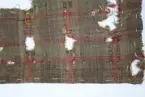 Rutigt klänningstyg från Junsele, Ångermanland. Halvylletyg vävt i tuskaft. Brungrön botten med kulörta ränder. Grönbrunt garn, troligen bomullsgarn i varp samt gult, blågrönt och rosa garn. Inslag i grönbrunt och rött ullgarn.