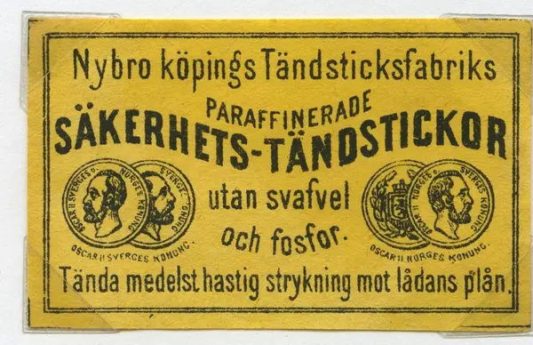 Tändsticksetikett från Nybro Tändsticksfabrik, "Nybro Köpings Tändsticksfabriks paraffinerade säkerhetständstickor utan svafvel och fosfor."