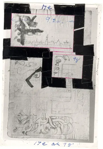 Kalmar slott. Kungsmakets kassettak med ramverkets tre olika moreskmönster i intarsia. Skisser av Nils Månsson Mandelgren 1848. På vissa plåtar har Martin Olsson klistrat eltejp för att markera hur bilden skulle beskäras i boken.