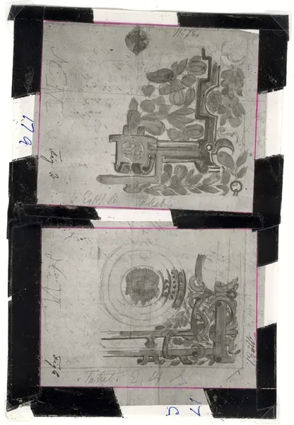 Detalj av kassettaket i Kungsmaket på Kalmar slott. Skisser av Nils Månsson Mandelgren 1848. På vissa plåtar har Martin Olsson klistrat eltejp för att markera hur bilden skulle beskäras i boken.