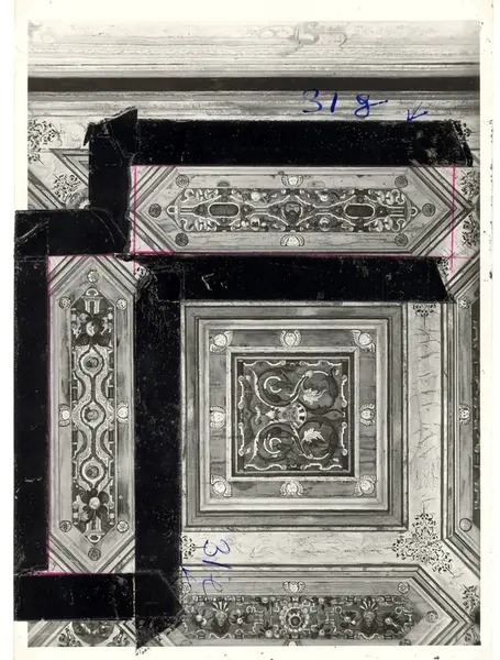 Detalj av kassettaket i Gyllene salen på Kalmar slott. På vissa plåtar har Martin Olsson klistrat eltejp för att markera hur bilden skulle beskäras i boken.