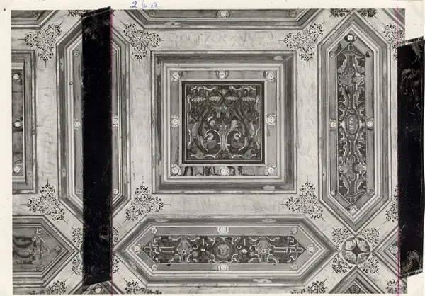Del av kassettaket i Gyllene salen på Kalmar slott. På vissa plåtar har Martin Olsson klistrat eltejp för att markera hur bilden skulle beskäras i boken.
