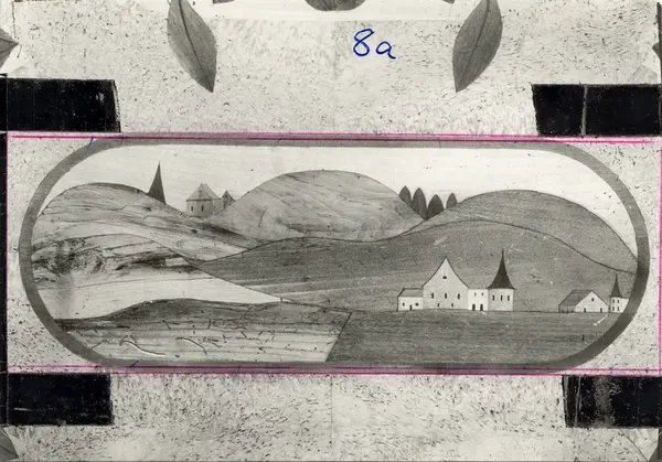 Kalmar slott. Detalj av Kungsmakets panel. Bilden skall troligen föreställa Gamla Uppsala. På vissa plåtar har Martin Olsson klistrat eltejp för att markera hur bilden skulle beskäras i boken.