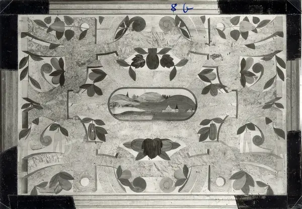 Kalmar slott. Detalj av Kungsmakets panel. Mittpatiet; bilden skall troligen föreställa Gamla Uppsala. På vissa plåtar har Martin Olsson klistrat eltejp för att markera hur bilden skulle beskäras i boken.