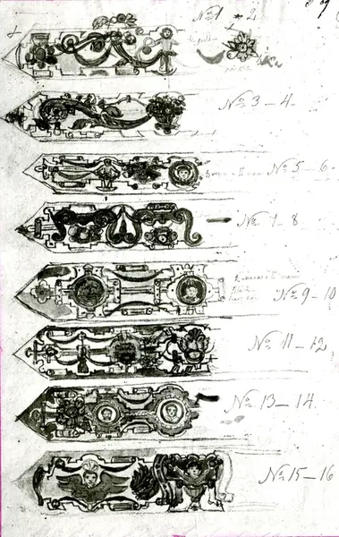 Gyllene salen på Kalmar slott. Skisser av Nils Månsson Mandelgren 1848. På vissa plåtar har Martin Olsson klistrat eltejp för att markera hur bilden skulle beskäras i boken.
