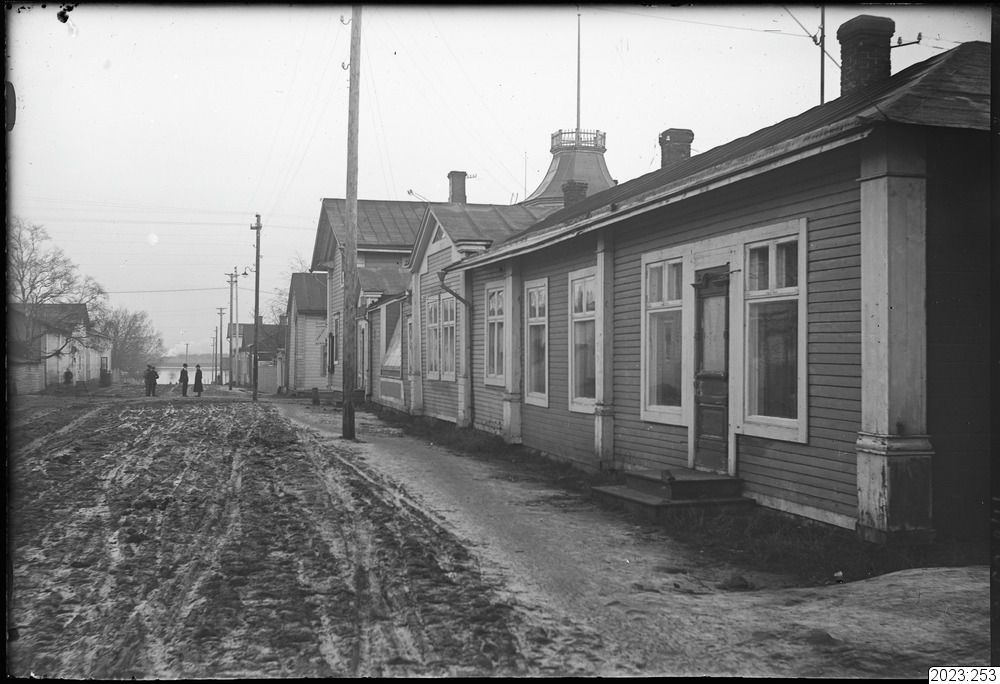 som står och pratar på den leriga gatan. Tid: 1920-tal.
