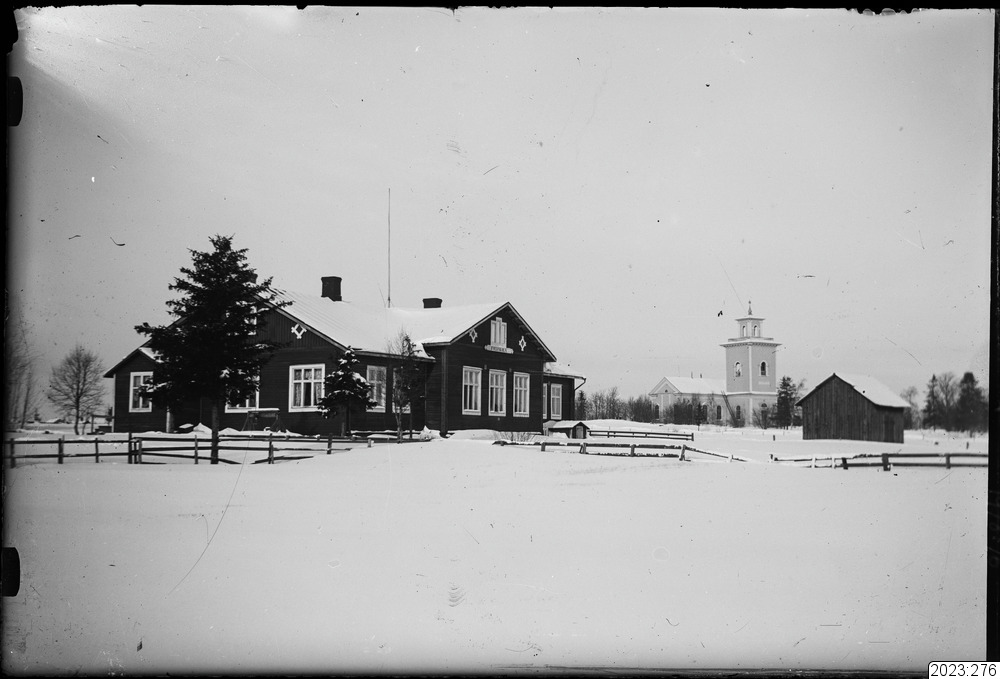 Södra folkskolan i Haparanda. Skolan en envånings rödmålad träbyggnad innehållande 5 st lärosalar samt ett gemensamt klädrum som också användes som samlings och leksal. Tvärs över gården syns utedasset, ett för flickor och ett för pojkar. Skolan byggdes omkring 1860. Kyrkan syns i bakgrunden. Tid: 1915-1920. Fysiskt original från Haparanda kommun med accessionsnummer 1978:76