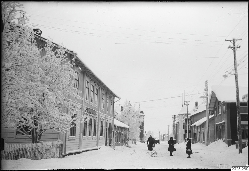 Gatumotiv. Köpmangatan med sparbanken till vänster. Tid: 1914-1918.Fysiskt original från Haparanda kommun med accessionsnummer 1978:80