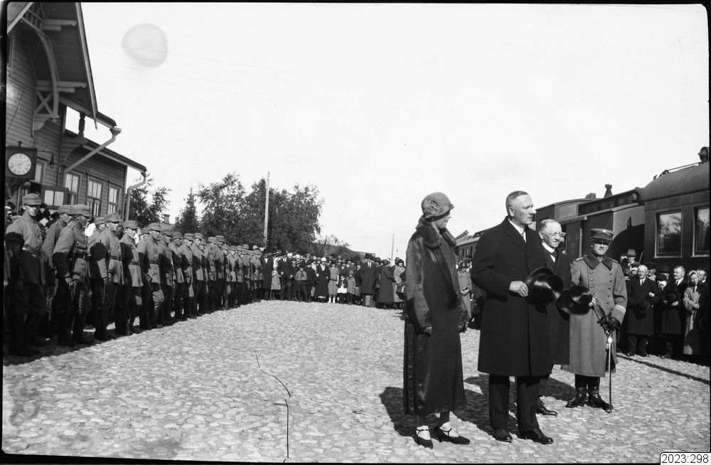 President Relander välkomnas på Torneå järnvägsstation. Tid: 1920-tal. Fysiskt original från Haparanda kommun med accessionsnummer 1978: