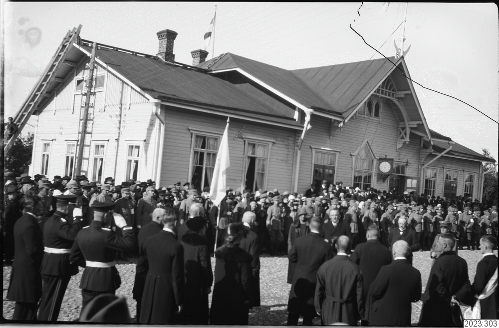 Presidentparet Relanders ankomst till Torneå. Välkomstcermoni i samband med detta. Stationsbyggnaden i bakgrunden. Tid: 1920-tal. Fysiskt original från Haparanda kommun med accessionsnummer 1978:103