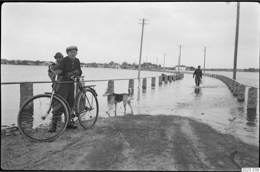 Cyklist och gående passerat över bron till Haparanda som översköljts av vatten i samband med översvämning och isgång i Torneälven. Tid: 1934. Fysiskt original från Haparanda kommun med accessionsnummer 1978:130