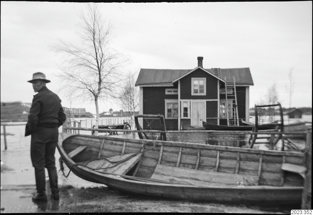 Hus omgärdat av vatten till följd av isgång iTorneälven. Tid: 1934.Fysiskt original från Haparanda kommun med accessionsnummer 1978:152