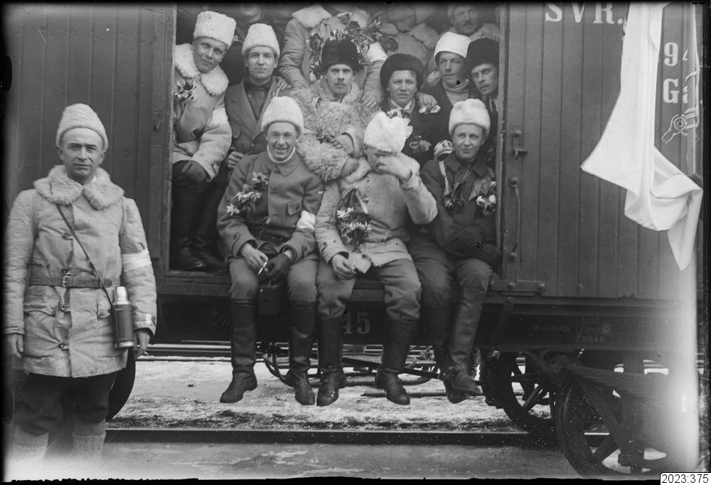 Hemvändande svenska soldater fr8n finska kriget, sittande i järnvägsvagn för vidare färd till respektive hemorter. Männen har blommor i rockslagen. Tid: 1918. Fysiskt original från Haparanda kommun med accessionsnummer 1978:175