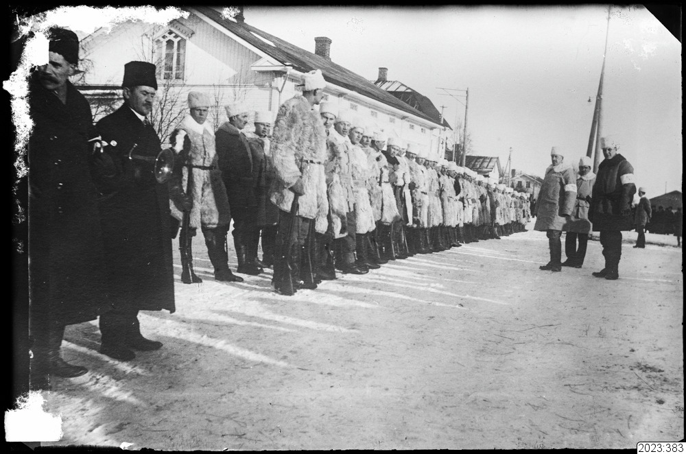 Pälsklädda finska soldater står givakt (finska skyddskåren). Tid: 1914-1918. Fysiskt original från Haparanda kommun med accessionsnummer 1978:183