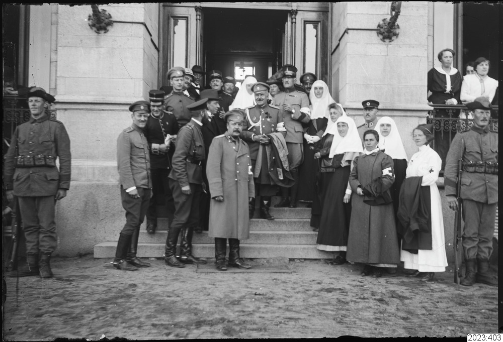 sjuksköterskor stående på stadshotellets trappa efter intagen lunch. Den ryske officeren med ägiljetter i mitten är general Schuvalow. FJärde sjuksköterskan fr. höger är Elsa Brännström. Tid: 1914-1918.