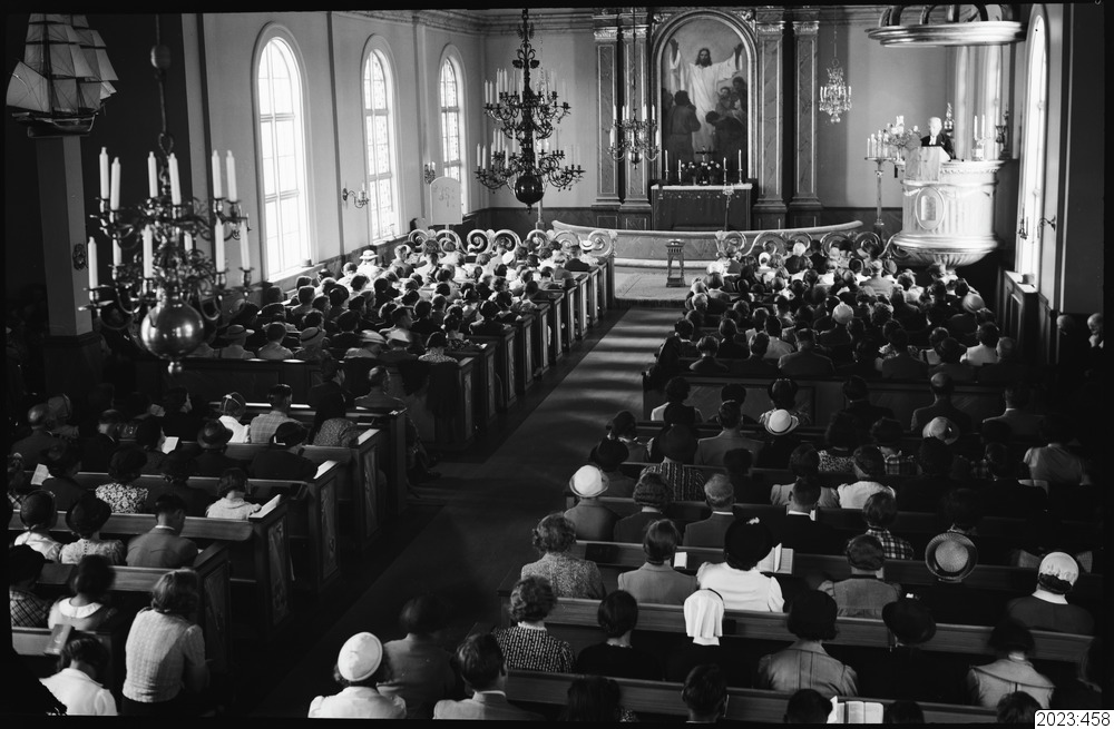 Interiörbild efter restaureringen i kyrkan 1937-1938 Gudstjänst pågår - predikan. Tid: 1938-1940. Fysiskt original från Haparanda kommun med accessionsnummer 1978:258